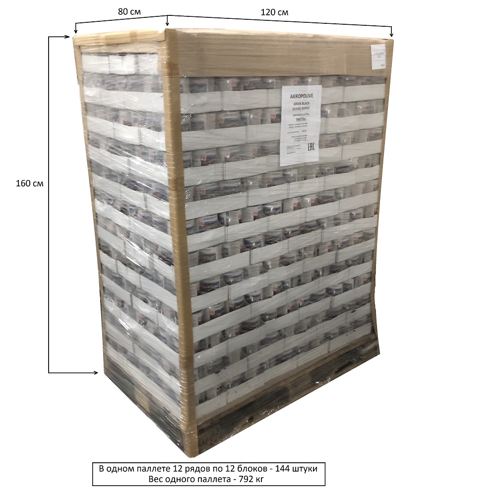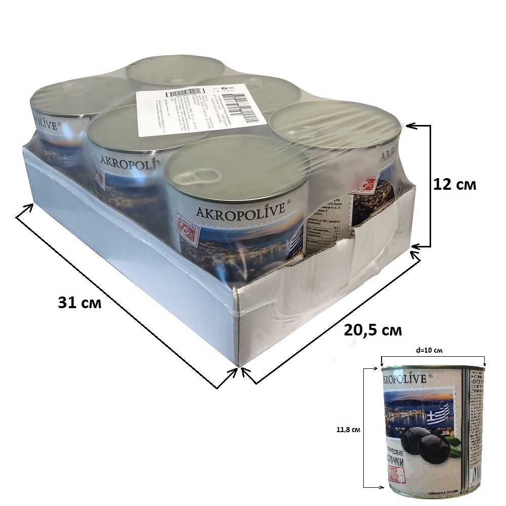 Состав: Вода питьевая, черные оливки(маслины) сорта Халкидики без косточки, соль морская, регулятор кислотности:молочная кислота, фиксатор окраски:глюконат железа. Пищевая ценность на 100 грамм: белки 1,4 г, жиры 19,6 г, углеводы 1 г, соль 2,1 г. Энергетическая ценность - 191 Ккал.