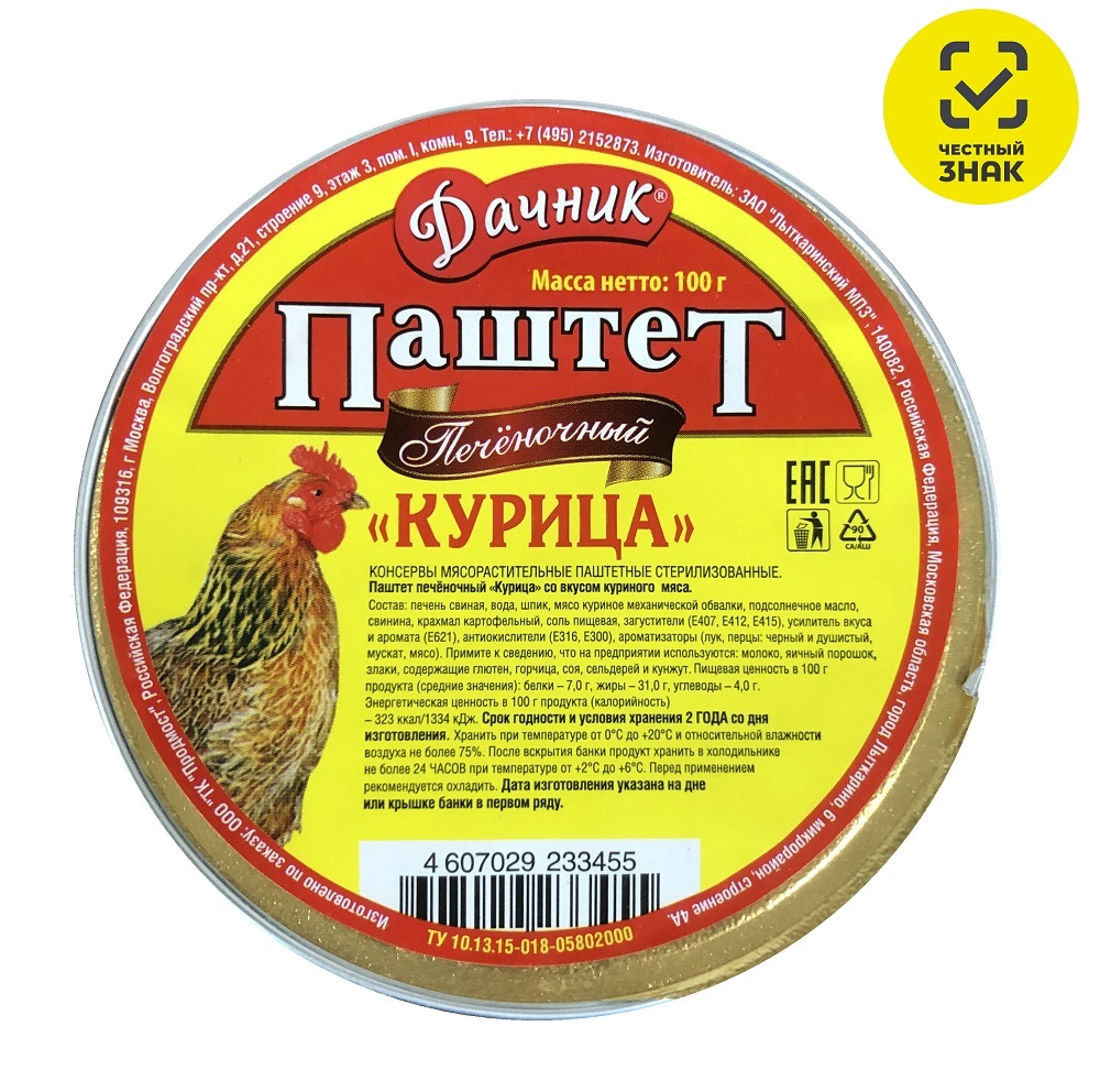 Состав: Печень свиная, вода, шпик, мясо птицы механической обвалки,подсолнечное масло , свинина, крахмал картофельный,соль пищевая, загустители (Е407,Е412,Е415), усилитель вкуса и аромата (Е621), антиокислители (Е316, Е300), ароматизаторы: лук, перцы: черный и душистый, мускат, мясо). Пищевая ценность на 100 грамм: белки 7 г, жиры 31 г, углеводы 4 г. Энергетическая ценность - 323 Ккал.