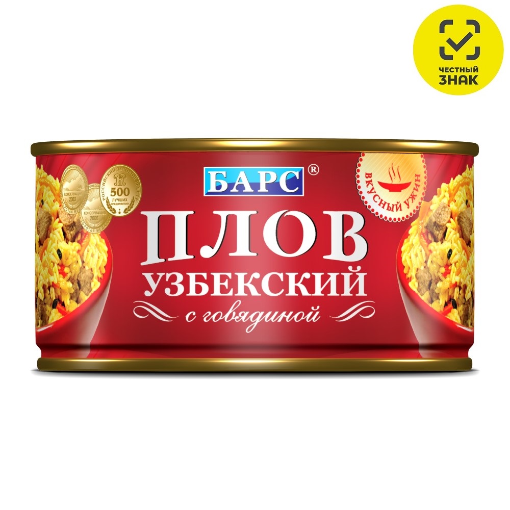 Состав: Говядина, крупа рисовая, вода, масло растительное, жир говяжий, лук, морковь, соль , пряности. Пищевая ценность на 100 грамм: белки 8,5 г, жиры 12 г, углеводы 20 г. Энергетическая ценность - 220 Ккал.