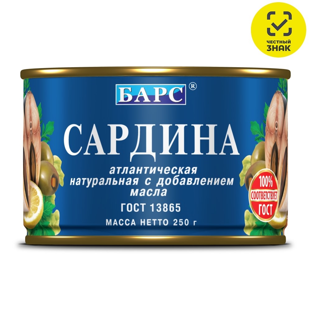 Состав: Сардина, масло растительное, соль, экстракт пряностей. Пищевая ценность на 100 грамм: белки 19 г, жиры 11 г. Энергетическая ценность - 180 Ккал.